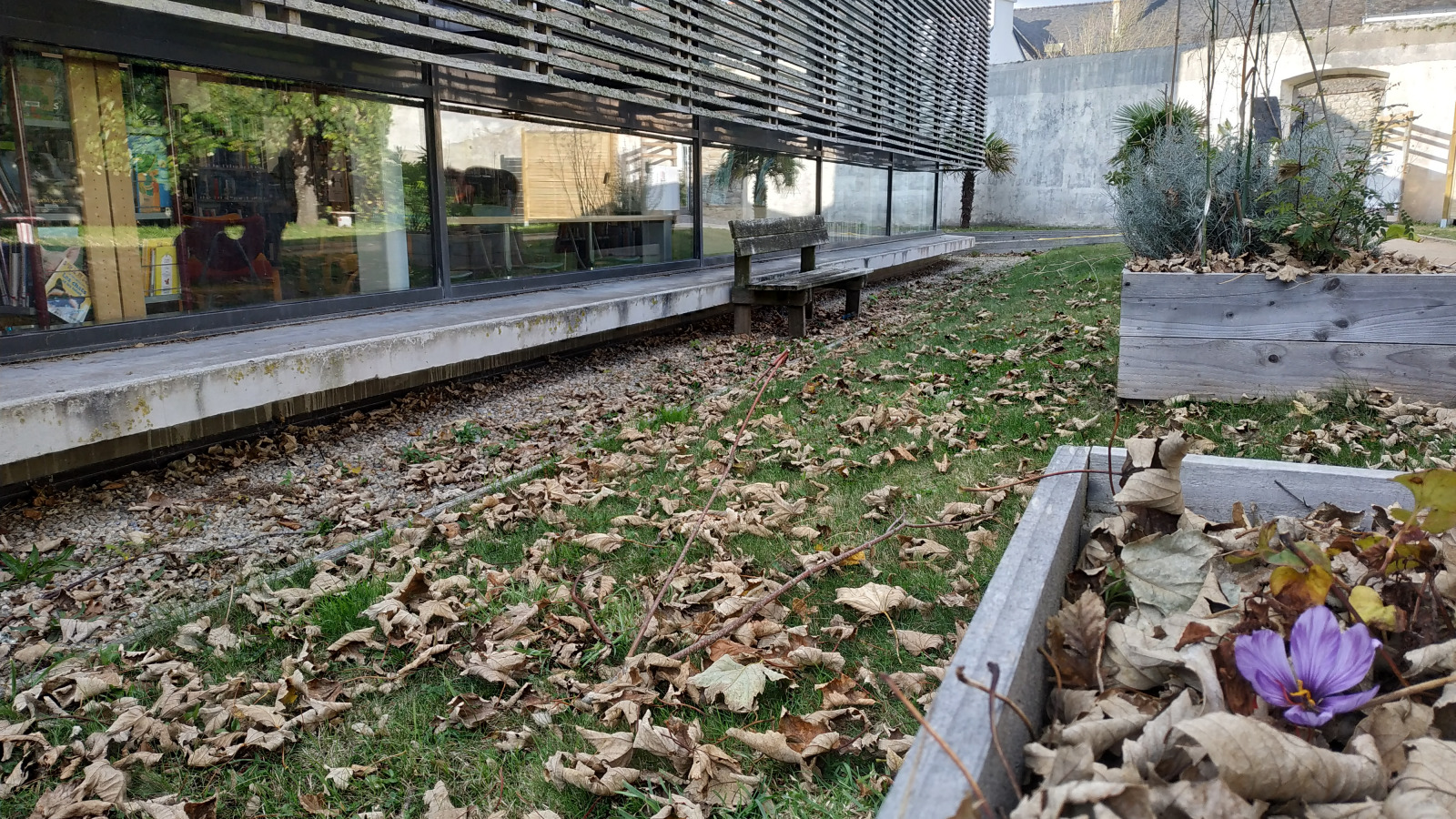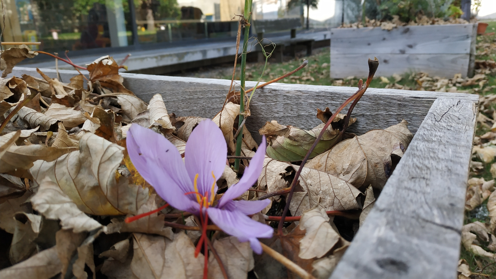 Nous sommes cependant ravis de voir les toutes premières fleurs mauves de nos Crocus sativus au jardin d' épices de la Médiathèque cet automne .